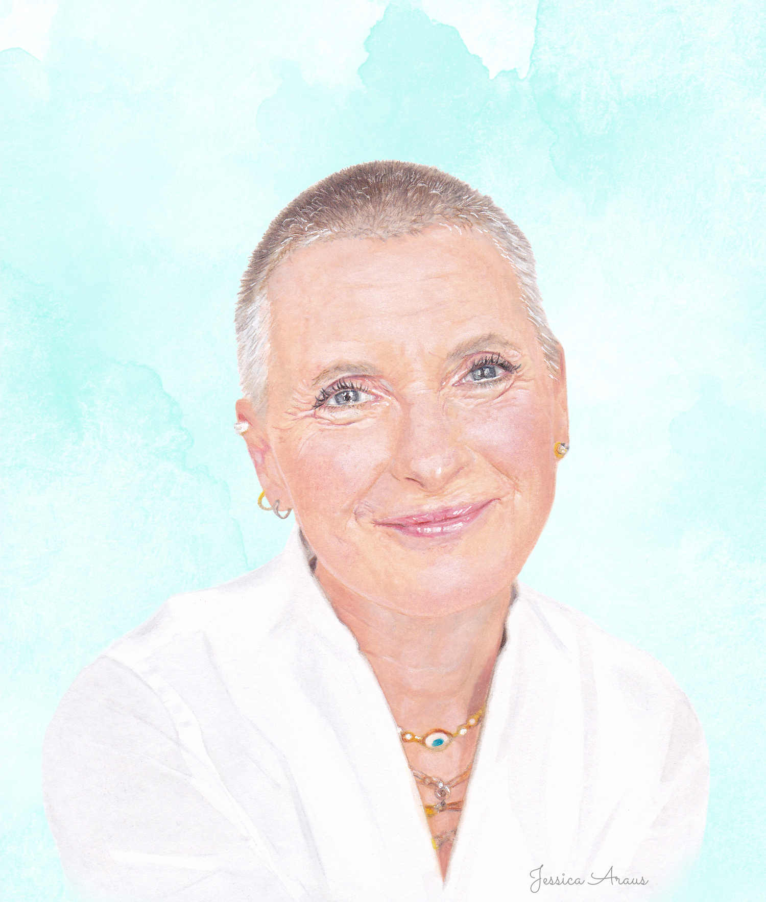 Self-initiated illustration of Elizabeth Gilbert. The portrait was painted with watercolor and colored pencils.